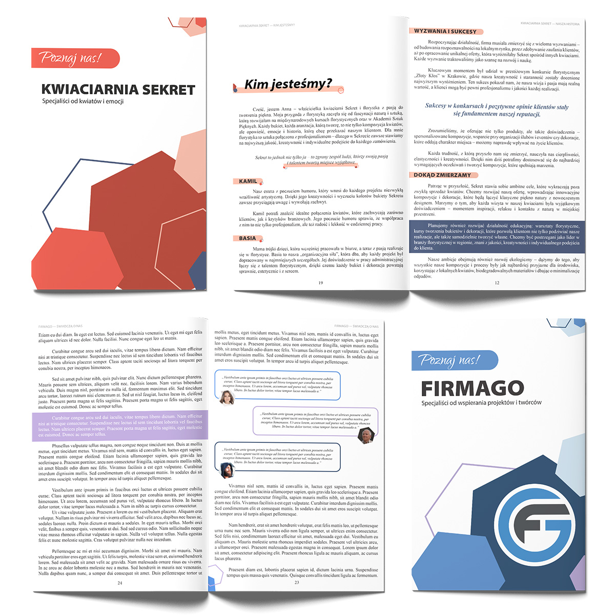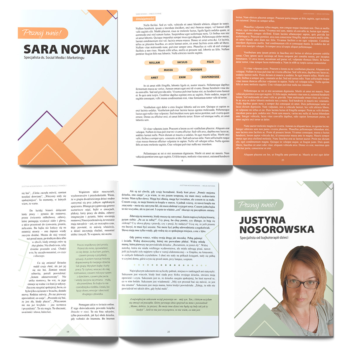Treść książki to rodzaj opowieści o Tobie – Twojej osobie, historii Twojej firmy, o tym, na czym polega Twoja działalność i co dobrego dajesz ludziom, w jaki sposób pomagasz klientom, jest też miejsce na dokładną ofertę oraz na opis Twoich największych sukcesów i dokonań.